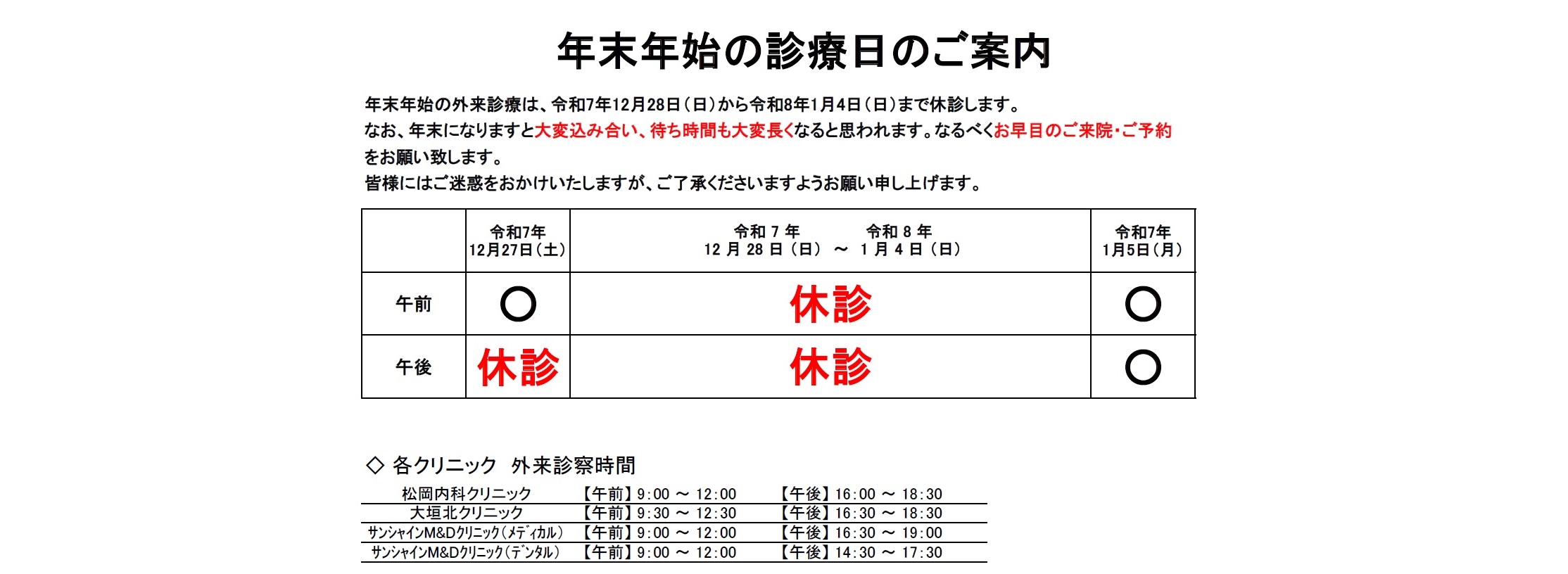 【2025年~2026年】年末年始の外来診察のお知らせ